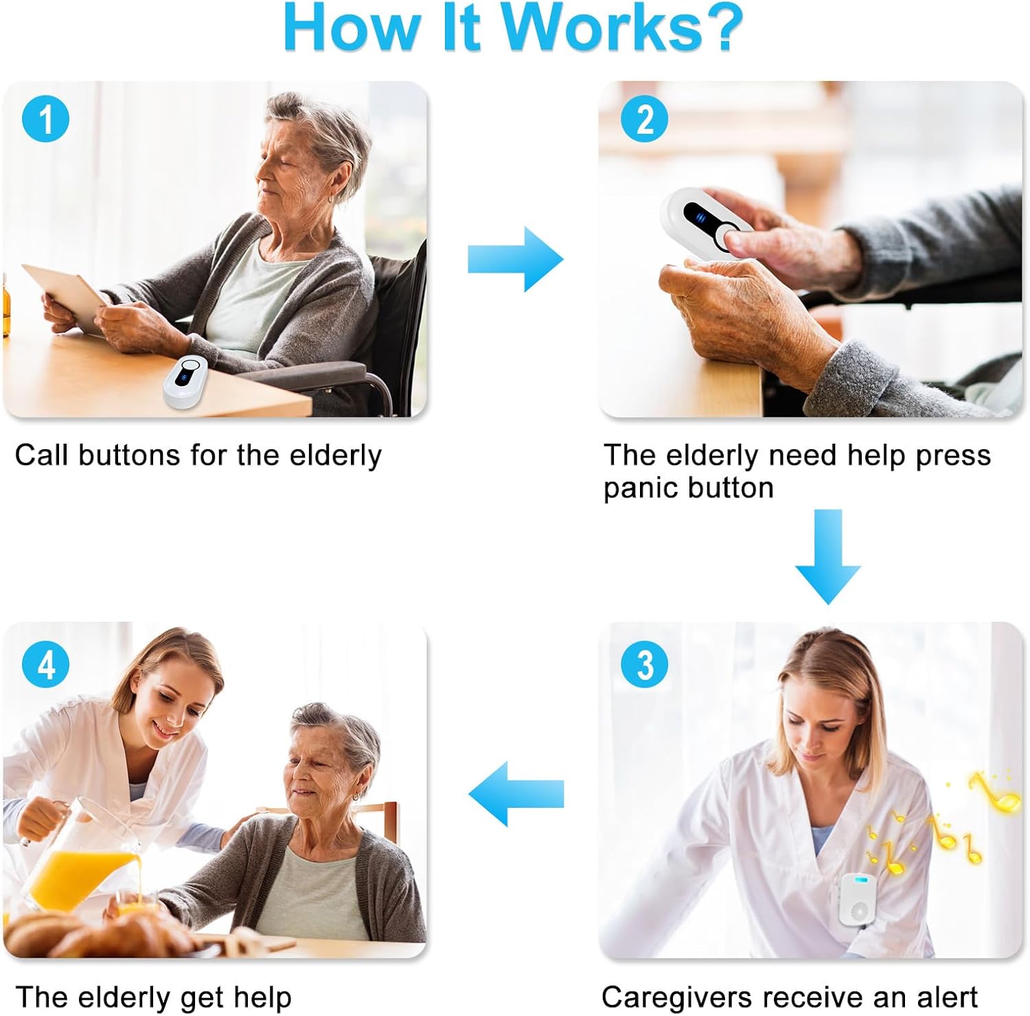 【Wireless Pager System】- 1 portable pagers, 2 waterproof call buttons. Make caregiver's work easier and take better care of family and patients. Emergency button ensures that the elderly, seniors, patients and disabled get help in time, and the portable receiver allows caregivers to hear the call immediately when they are resting, working or doing housework