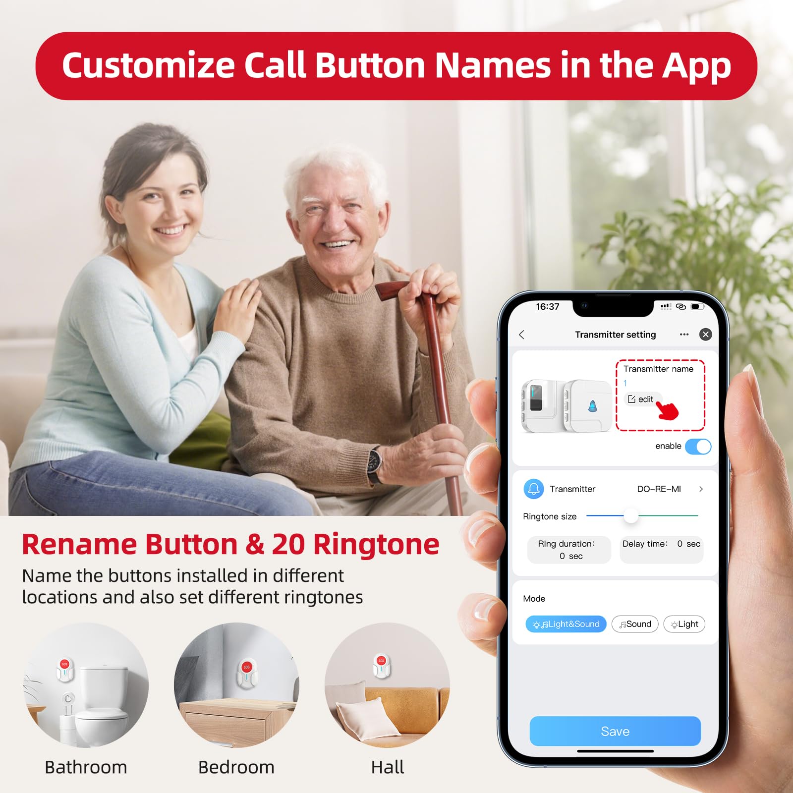 - 20 Ringtone & Custom Button Name: You can set different ringtones and names for each emergency button in the app, which helps you quickly know who is asking for help.The call bell system's receiver has 20 ring tones and 5 volume levels.