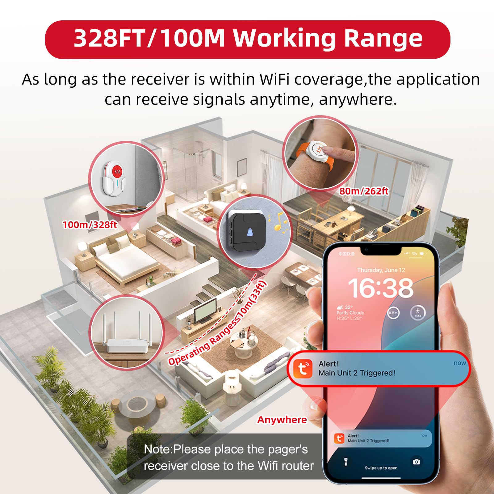 - Wireless APP Caregiver Pager: The WIFI wireless caregiver pager use 433MHz technology for a 328ft /100m range, penetrating walls and doors, suitable for most homes; The Wireless Receiver connects easily to home Wi-Fi for smart global access.Note: Only supports 2.4G Wi-Fi, not 5G.
